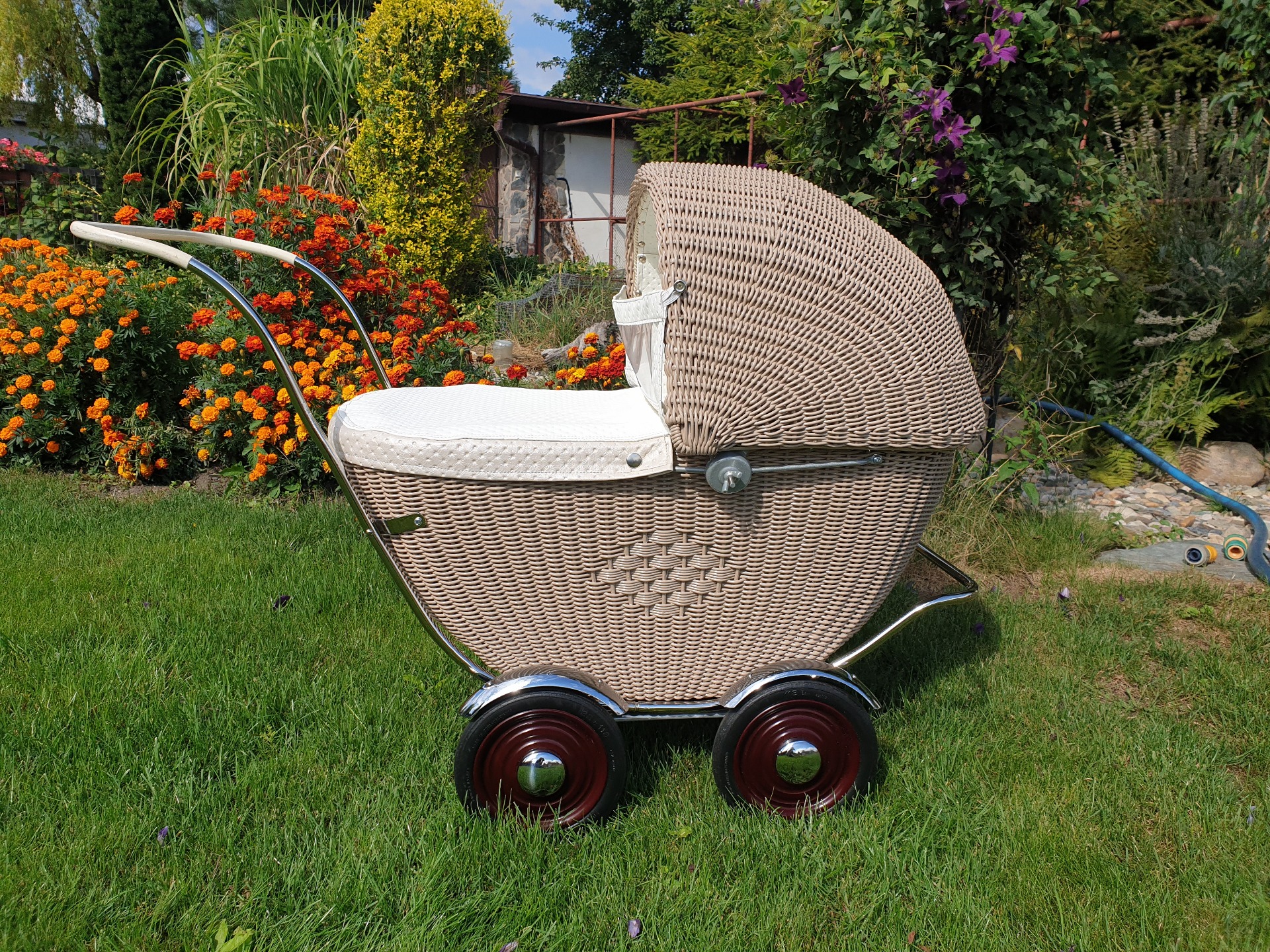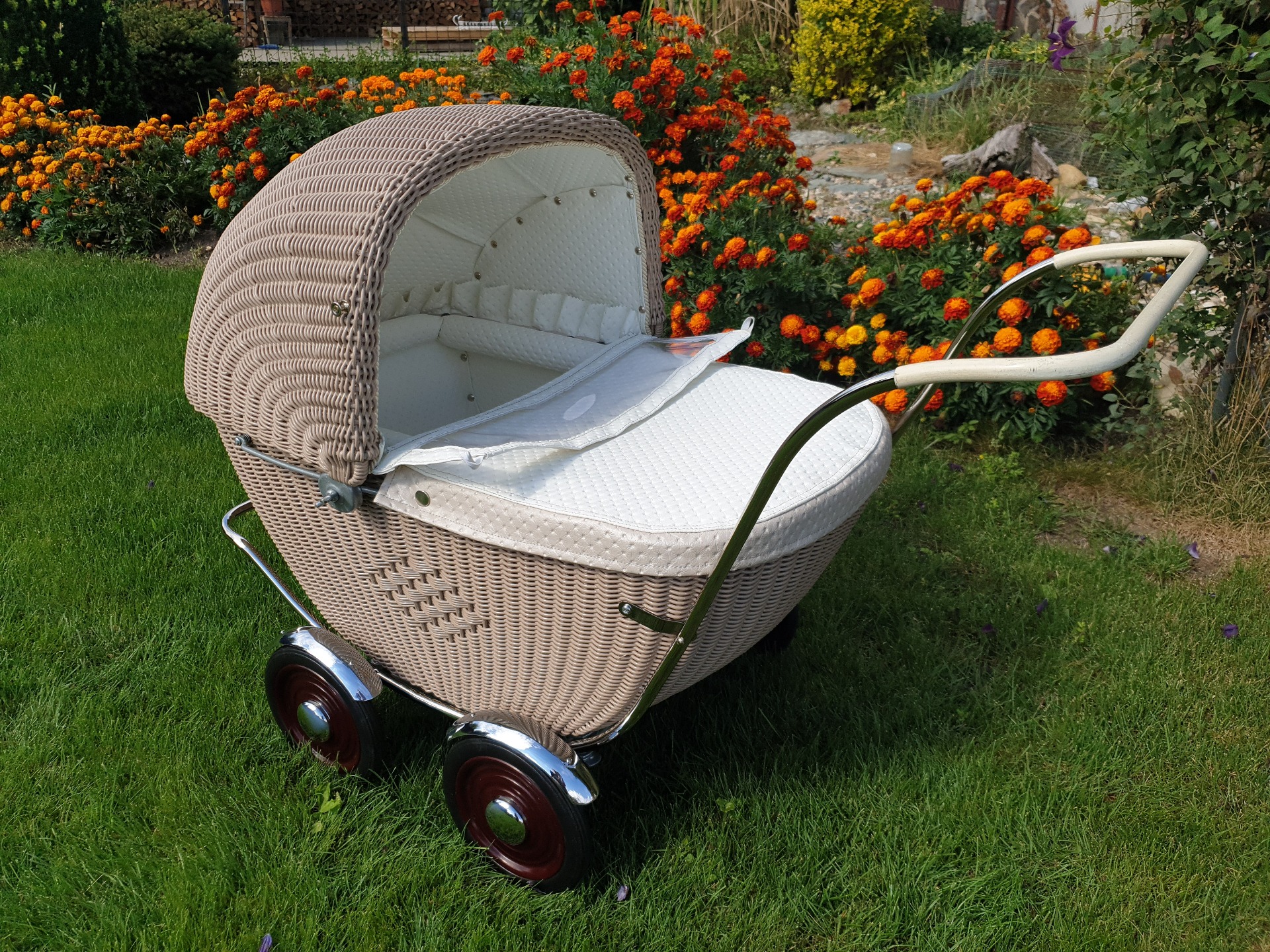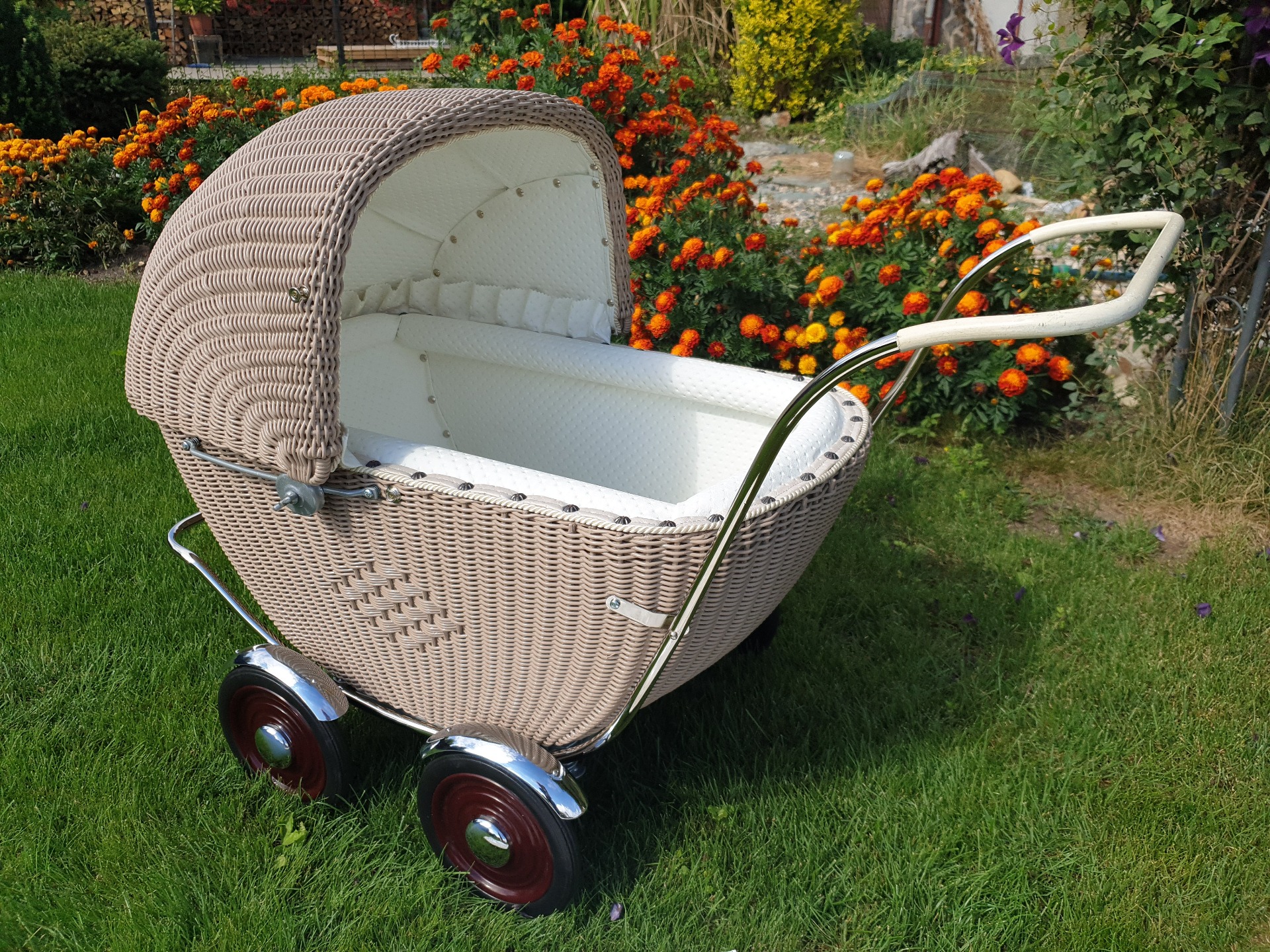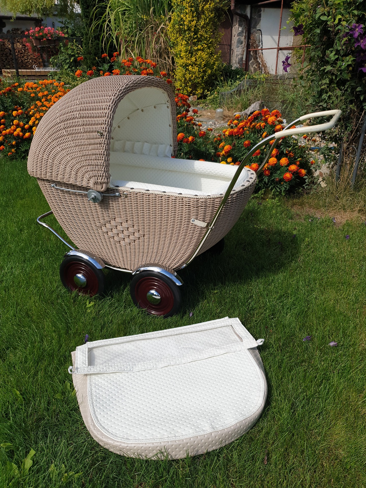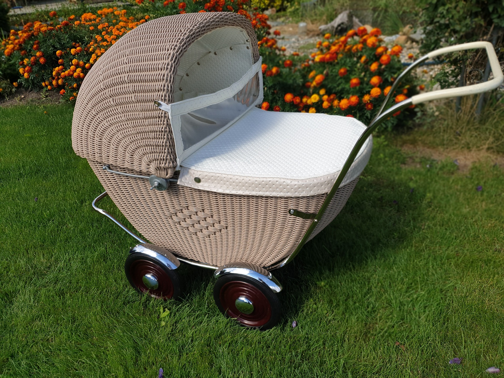 Představuje se vám jeden z poslední modelů takzavené "kukaně" z bužírkového výpletu, která skoničla svou vyrobu v roce 1965. Bužírka stříknutá barvou Latte (dětská nezavadná barva), uvnitř bílá koženka s lehkým zdobením, ozdobné hřebíčky s patinou, kovová konstrukce v chromu